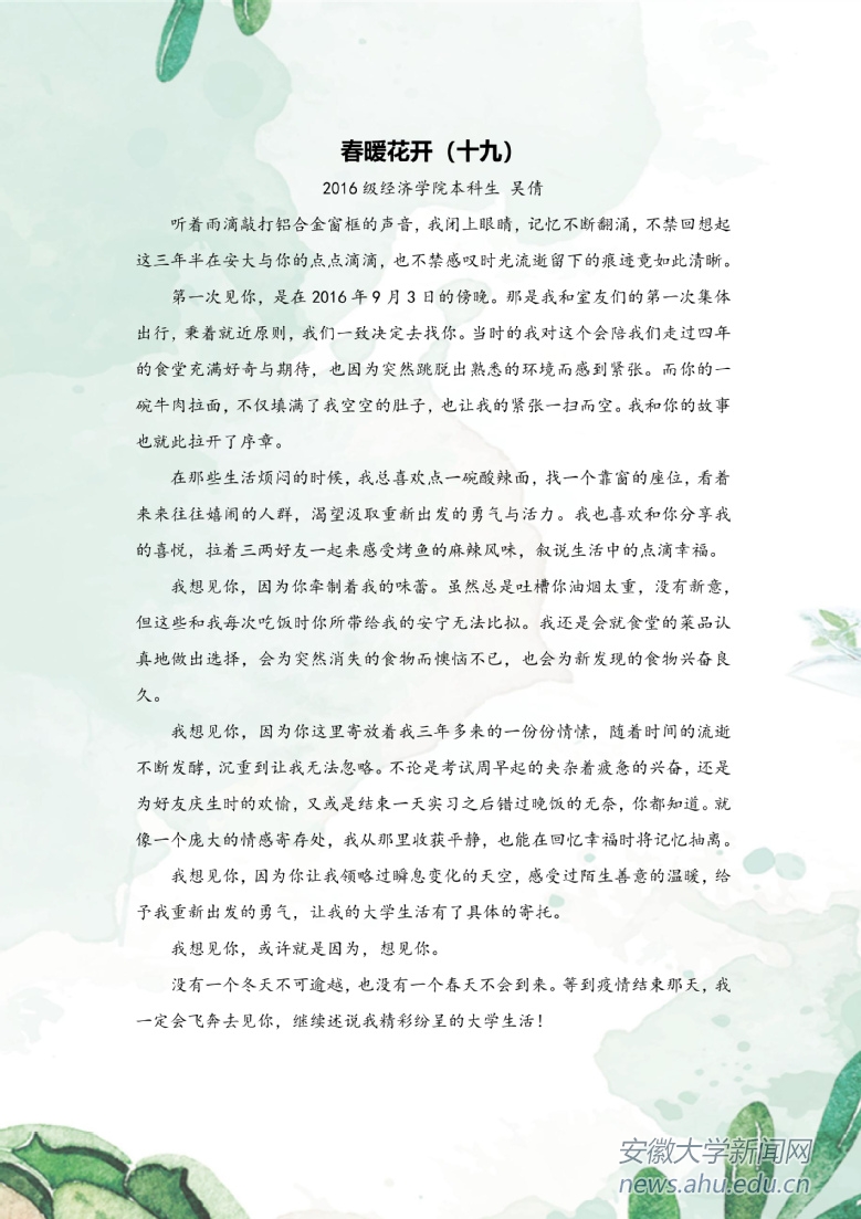 本网讯(新闻中心)疫情当前,安徽大学积极响应教育部“停课不停教、不停学”的号召,各教学单位通过各种形式开展教学工作。千山万水隔不住安大师生对菁菁校园的思念,他们将深情融入字里行间,共待春暖花开。