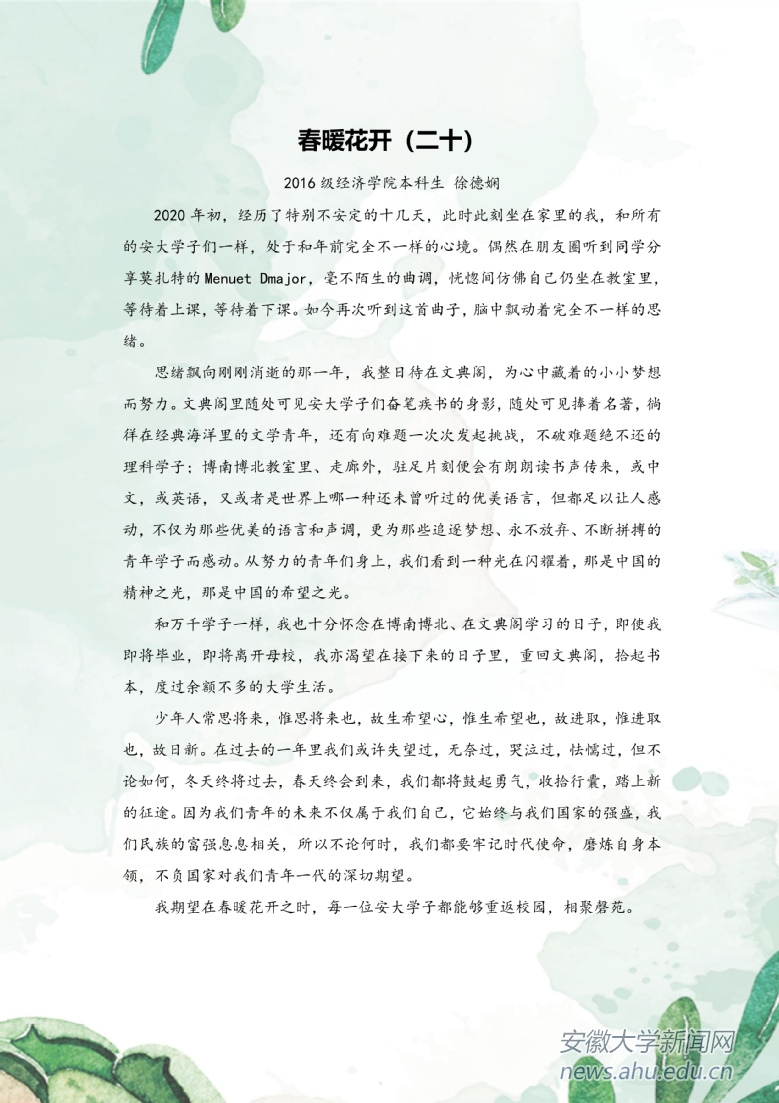 本网讯(新闻中心)疫情当前,安徽大学积极响应教育部“停课不停教、不停学”的号召,各教学单位通过各种形式开展教学工作。千山万水隔不住安大师生对菁菁校园的思念,他们将深情融入字里行间,共待春暖花开。