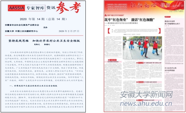 面对疫情,副院长张德元组织专家对疫情给“三农”发展造成的负面影响展开对策研究,目前完成《疫情防控期间助力脱贫攻坚的对策建议》《坚持底线思维 加快补齐农村公共安全短板》《面对疫情新发展阶段长三角地区应有新举措》《新型冠状疫情对河北省蔬菜产业影响及对策建议》《优化野生动物保护名录 完善<野生动物保护法>》等15期“专家智库资讯参考”。副院长胡艳组织专家对新型冠状病毒疫情的城市治理进行政策研究,组织完成三篇文章,其中特聘研究员吴宗友的文章“以人民为中心的社区治理创新”在《光明日报》刊发。发挥《安大智库》的咨政建言作用,宋宏教授在2020年第3期撰写的《关于疫情后我省经济工作的研判与建议》、毕金平教授在2020年第4期撰写的《规范查处防疫期间“哄抬物价”行为执法的建议》等咨政报告送呈省委省政府,另编发3篇智库建议提交省委宣传部《安徽智库建言专报》。
