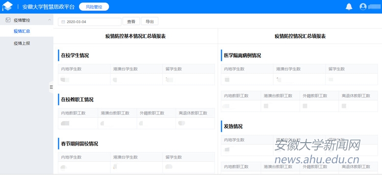 在统计师生信息的基础上,安徽大学网络信息中心通过部署校级网络思政平台,对接舆情监测平台每日健康数据,开发疫情监控和疫情上报功能模块,实现校级健康数据自动统计分析、分级复核纠错功能,进而优化当前校级疫情监控人员工作流程,减少重复工作,进一步实现疫情精准防控。