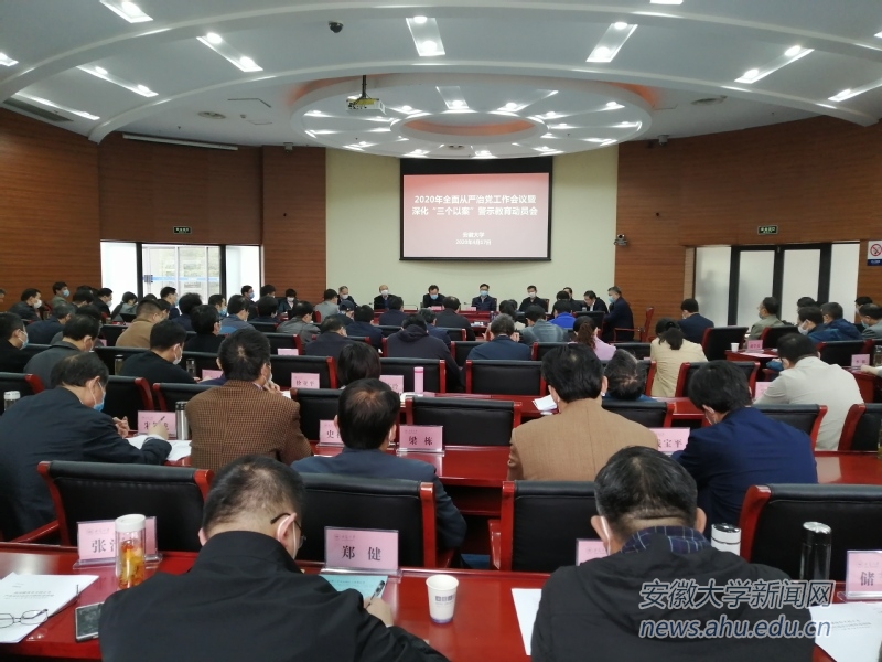 本网讯(新闻中心 徐红)4月17日,学校在磬苑校区办公楼B204召开2020年全面从严治党工作会议暨深化“三个以案”警示教育动员会。会议主要任务是坚持以习近平新时代中国特色社会主义思想为指导,深入贯彻党的十九大和十九届二中、三中、四中全会精神,认真落实十九届中央纪委四次全会和省纪委十届五次会议精神,部署安排2020年全面从严治党工作,动员开展深化“三个以案”警示教育工作。校党委书记蔡敬民,校长匡光力,常务副校长王群京,校党委副书记胡小松,校党委常委、副校长俞本立、薛照明、程雁雷,校党委常委、纪委书记、监察专员王忠,校党委常委、副校长周飞出席会议,副校长钱家盛列席会议。会议由匡光力主持。