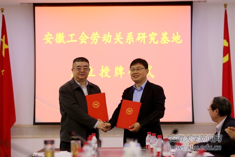 安徽省人大常委会副主任、安徽省总工会主席李明、安徽总工会党组书记、副主席徐发成,校党委书记蔡敬民、副校长程雁雷共同为研究基地揭牌。校党委宣传部部长、法学院院长郭志远和省总工会权益保障部部长张旭光签署合作协议。