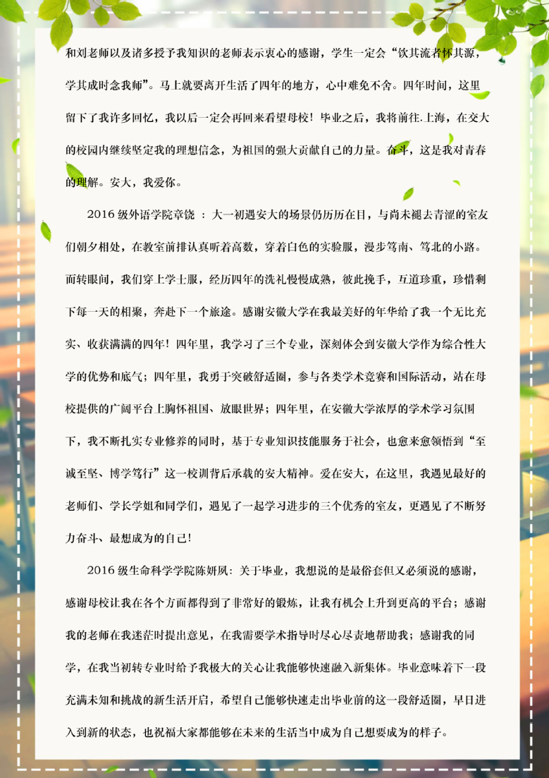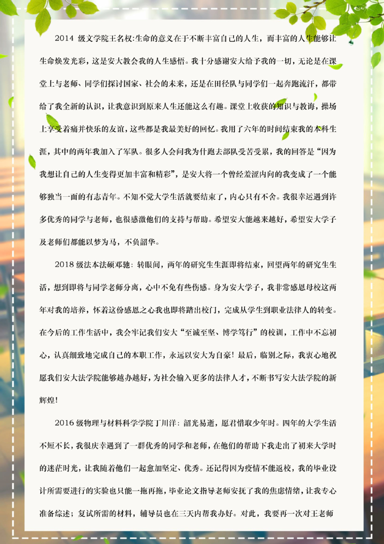 合欢花开,又到了骊歌唱响的时节。疫情没有隔断我们对彼此的思念,你们从五湖四海归来,只为了践诺一次团圆。不舍、感激这样的情绪和校园里的花香杂糅在一起,弥漫在空气中,也弥漫到了你们的心里。过去的时光见证了你们的成长和努力,未来可期,希望你们始终保持优秀、保持专注、保持善良,做有理想、有本领、有担当的新时代青年。请你们勇敢地向前走,母校始终在你们身后为你们加油!