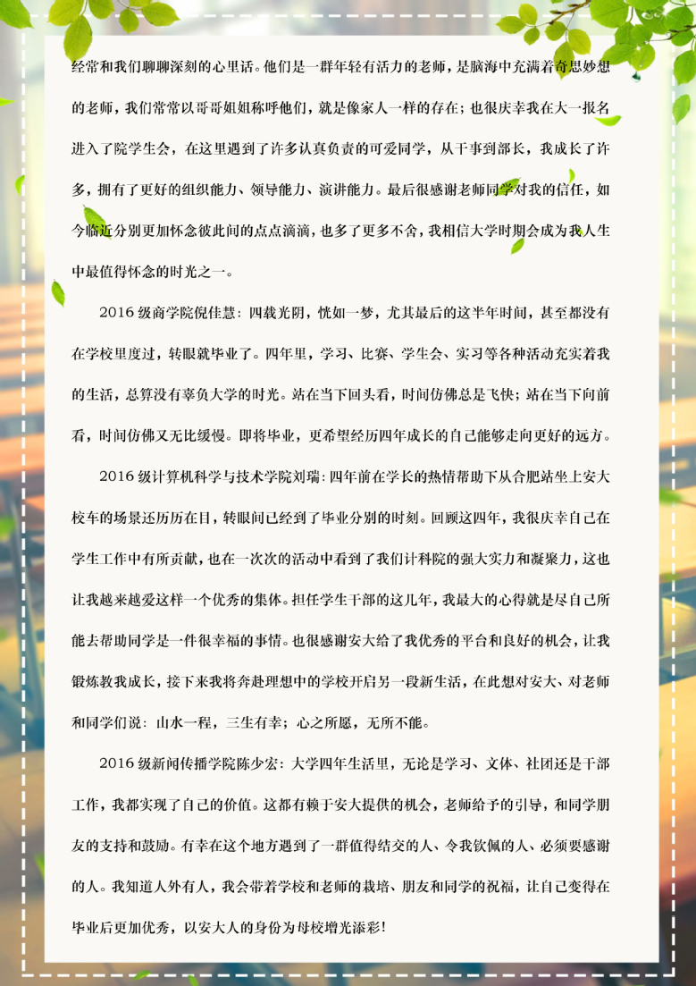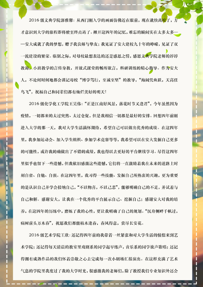 合欢花开,又到了骊歌唱响的时节。疫情没有隔断我们对彼此的思念,你们从五湖四海归来,只为了践诺一次团圆。不舍、感激这样的情绪和校园里的花香杂糅在一起,弥漫在空气中,也弥漫到了你们的心里。过去的时光见证了你们的成长和努力,未来可期,希望你们始终保持优秀、保持专注、保持善良,做有理想、有本领、有担当的新时代青年。请你们勇敢地向前走,母校始终在你们身后为你们加油!