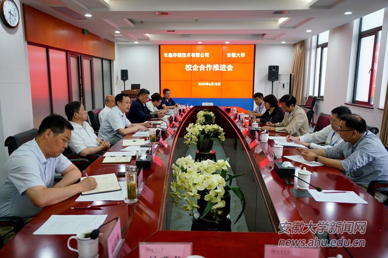 本网讯(新闻中心)6月18日下午,长鑫存储技术有限公司与安徽大学校企合作推进会在磬苑校区办公楼举行。长鑫存储党委书记、常务副总经理王厚亮,校党委书记蔡敬民,常务副校长王群京,校党委常委、副校长薛照明,副校长钱家盛出席会议。