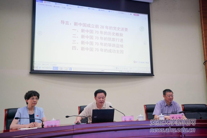学习小组成立大会结束后,举行了学校机关党委庆祝建党99周年党史报告会暨机关党委理论学习中心组(扩大)学习会、机关青年理论学习小组第一次集中学习会,会议邀请安徽省委党史研究院副院长、安徽省社会科学界联合会副主席苗健作《遂行历史任务 践行初心使命——关于党在新中国70周年凯歌行进而又筚路蓝缕历史的回顾与思考》的报告,胡小松主持报告会,党委常委、副校长程雁雷出席会议,机关党委理论学习中心组成员、机关党委所属各党支部委员、机关青年理论学习小组成员聆听了报告。