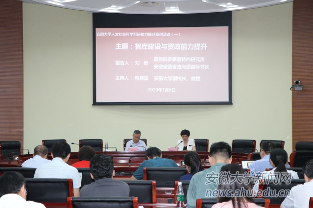 本网讯 (人文社会科学处)为提升我校智库建设水平和广大教师科研能力,有力支撑“双一流”建设,由校人文社会科学处和校社会科学界联合会组织策划的首场科研能力提升活动于7月8日在磬苑校区举行。本次活动邀请了国务院参事室特约研究员、安徽省委省政府原副秘书长、安徽大学创新发展战略研究院讲席教授刘奇作主题为“智库建设与资政能力提升”学术报告会,报告会由校党委常委、副校长程雁雷教授主持。各相关院系负责人、科研机构负责人、中青年教师90余人参加会议。