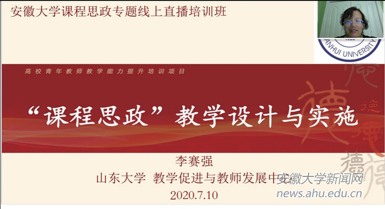 本网讯(党校/教师发展中心)为深入贯彻落实全国全省教育大会、全国全省高校思想政治工作会议精神,按照教育部《高等学校课程思政建设指导纲要》《安徽大学“课程思政”实施方案》的要求,提升我校教师开展课程思政建设的意识和能力,发挥每门课程的育人作用,实现全员全过程全方位育人,提高人才培养质量,党委党校(教师发展中心)邀请了清华大学马昱春、山东大学李赛强两位专家就如何开展课程思政教育作专题线上直播培训,助力我校教师切实理解和有效践行课程思政的理念与方法。