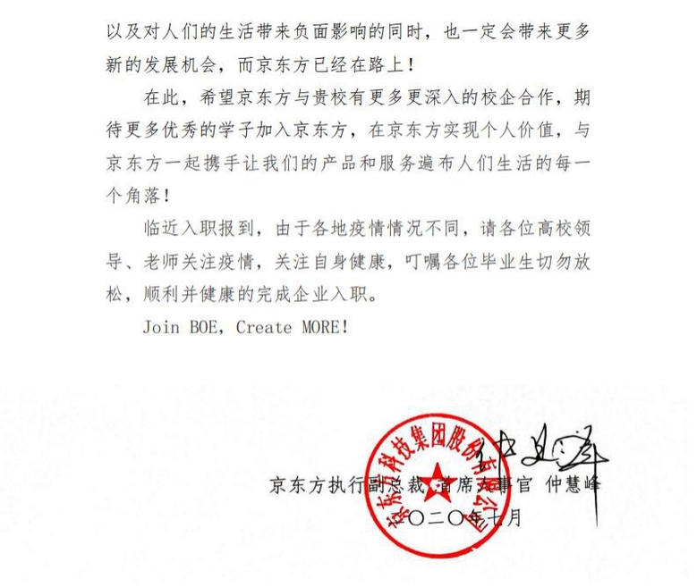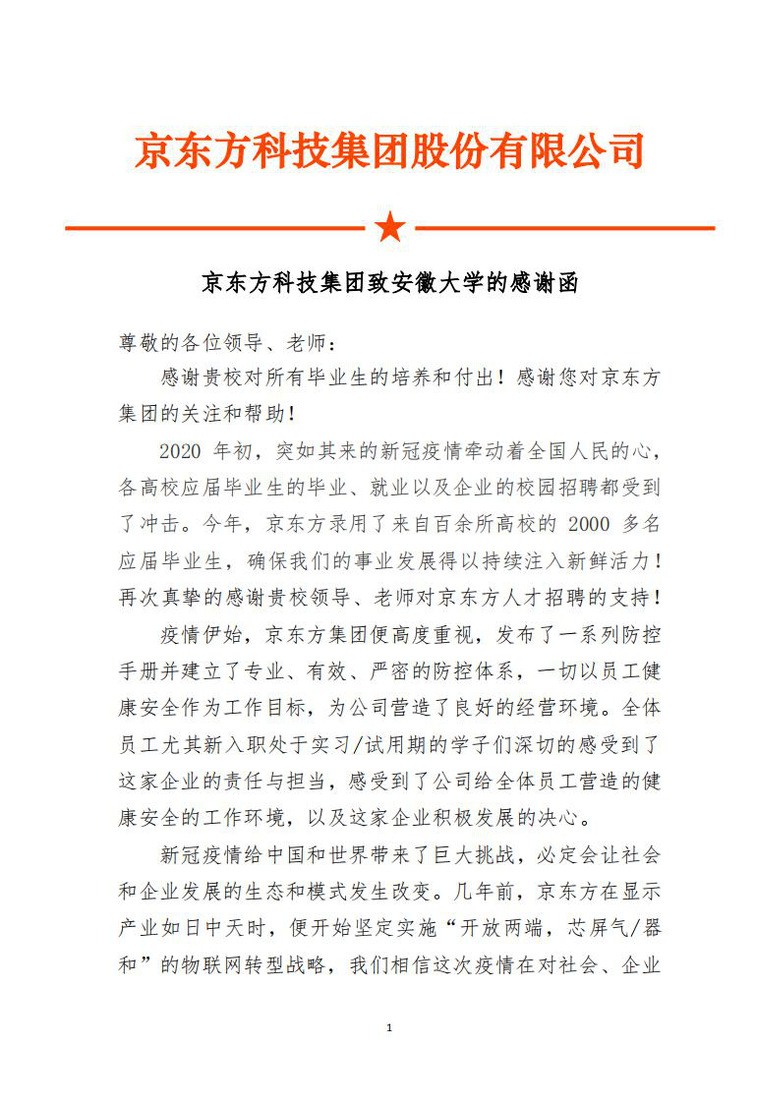本网讯(学生处)近日,京东方科技集团股份有限公司专门致函我校,就今年以来特别是疫情期间我校在人才选聘、校企合作等方面给予的支持表示感谢。感谢函原文如图: