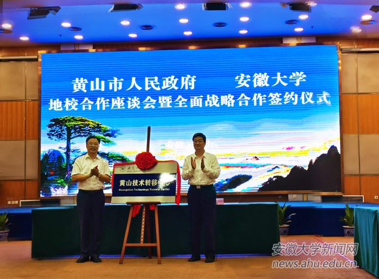 本网讯(发展规划处)8月7日下午,我校与黄山市人民政府校地合作座谈会暨全面战略合作签约仪式在黄山国际大酒店举行。校长匡光力、黄山市市长孙勇分别致辞,并共同为安徽大学黄山技术转移中心揭牌,副校长程雁雷与黄山市委常委、常务副市长朱策代表双方签订战略合作协议,黄山市副市长程红、黄山市政府秘书长汪德宝出席签约仪式。