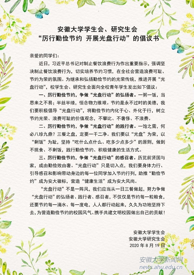 【文明校园】安徽大学学生会、研究生会“厉行勤俭节约 开展光盘行动”的倡议书