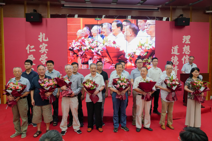 新进教师代表向从教三十年、四十年的老教师代表沈玉华、柯导明、吴家荣、周乾、温纯如、荣兆梓、章尚正、段华洽献花。老教师同时为新进教师代表佩戴校徽。全体新进教职工起立,在荣兆梓教授带领下,举起右拳,面向国旗庄严宣誓。