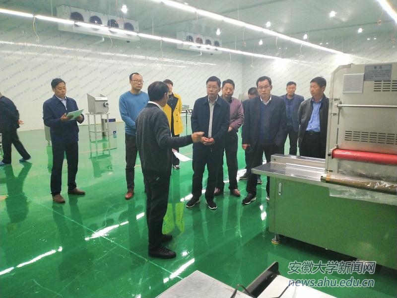 调研组一行先后考察走访了由我校帮扶工作队支持兴建的村办企业——阜南县绿海辉煌源生态食品有限公司,阜南樱花合作社儿菜种植基地,听取企业负责人介绍、参观生产流水线,了解冷冻肉类食品和蔬菜的加工、储存等细节,探讨我校食堂与企业合作、促进消费扶贫的可行性。