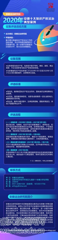 为深入贯彻习近平总书记考察安徽重要讲话和关于全面加强知识产权保护工作的重要指示精神,集中展示我省知识产权法治工作的成就,充分发挥典型案例的示范借鉴作用,助力法治安徽建设,安徽法治研究院于12月1日发布关于开展“2020年安徽十大知识产权法治典型案例”征集评选活动的公告。