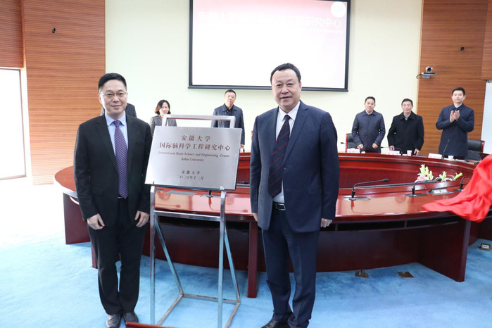 本网讯(计算机科学与技术学院姜鹏新)12月6日上午,安徽大学国际脑科学工程研究中心揭牌仪式在磬苑校区行政楼B204举行。校党委书记蔡敬民、中加健康工程研究院院长张弓教授出席仪式,并为安徽大学国际脑科学工程研究中心揭牌。蔡敬民代表学校向张弓颁发聘书。