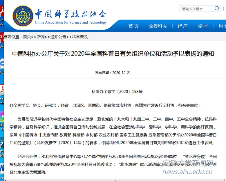 本网讯(科学技术处 团委)近日,中国科学技术协会对2020年全国科普日有关组织单位和活动进行了表扬,由安徽大学联合阜南县王化镇科协在王化镇举行的科技体验活动获评“2020年全国科普日优秀活动奖”。