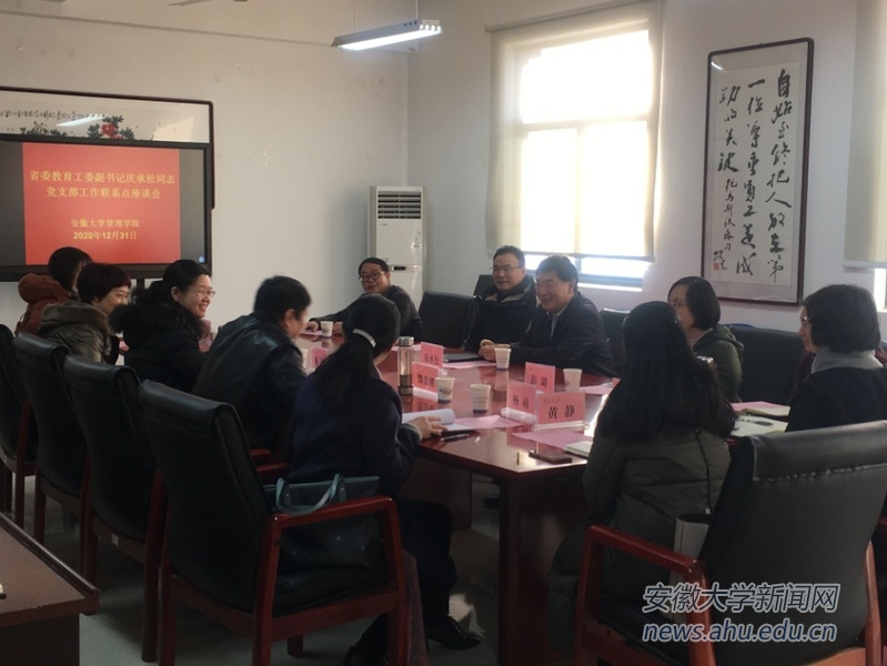 本网讯(党委组织部)2020年12月31日上午,省委教育工委副书记庆承松来到安徽大学管理学院档案学教工党支部,参加党支部联系点有关活动,与支部党员交心谈心、座谈交流。