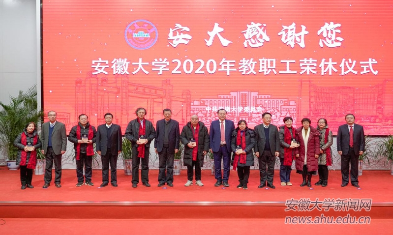 41位荣休教职工及相关单位负责人观看了2020年荣休教职工视频。艺术学院徐美玉老师独唱《我的深情为你守护》,老年大学晚晴合唱团献唱《沁园春·雪》。仪式在全场人员起立合唱的《安徽大学校歌》声中结束。