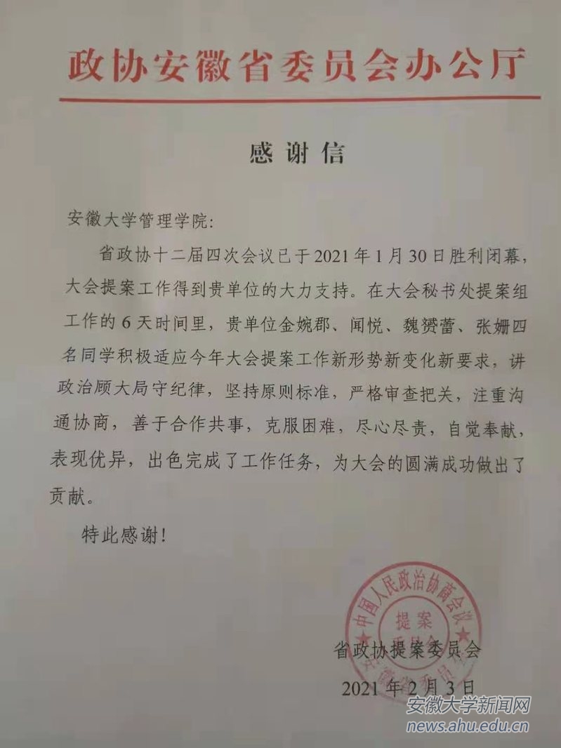本网讯(通讯员 胡芳芳)近日,我校收到来自省政协提案委员会的感谢信,感谢管理学院金婉郡、闻悦、魏赟蕾、张姗四名同学在省政协十二届四次会议提案工作中的优秀表现。