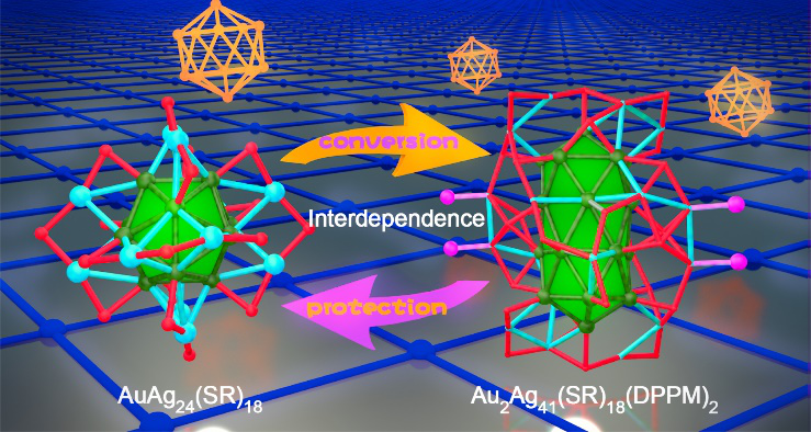 近期,该研究团队报道了一组共晶化的金属团簇,并通过X射线单晶衍射(SC-XRD)技术确认了化合物的原子结构—AuAg24(SR)18 和Au2Ag41(SR)26(Dppm)2,二者在单元晶胞中占比各为50%;详细揭示了共结晶簇合物在形成过程中组分间的相互作用,形成了“命运共体”,最终建立了一种具有“相互依存”特性的双金属纳米团簇体系,这与生物界中的互利共生法则极为相似。该项工作深刻揭示了团簇间相互依存的关系,为理解团簇的生长和稳定机理提供了理论依据。