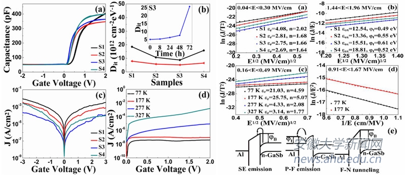 该课题组创造性提出了新型界面钝化方法:通过调节(NH4)2S溶液的PH值来提升对GaSb表面硫化效果,从而优化高k介质/GaSb衬底之间界面特性。基于中和的(NH4)2S可有效降低溶液的腐蚀性且形成较厚的硫保护层,制备的Yb2O3/GaSb MOS电容器不仅进一步抑制了器件的漏电流,同时有效降低了沟道层界面态密度(~35%)。此外,在低温测试下,利用中和的(NH4)2S处理获得的器件实现了优异的电流-电压特性。该研究工作不仅揭示了GaSb的表面特性,还相继报道了MOS电容器漏流浮动的工作机理。相关的研究成果对III-V族高迁移率CMOS工艺以及低功耗、高性能微电子领域的发展具有重要的意义。