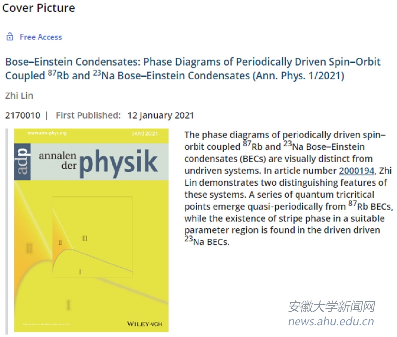 论文由我校林志副教授独立完成,成果以“Phase Diagrams of Periodically Driven Spin–Orbit Coupled 87Rb and 23Na Bose–Einstein Condensates”为题,作为封面文章,发表在具有悠久历史的德国著名杂志《物理年鉴》[Annalen der Physik (Berlin) 2021, 533, 2000194] 上。
