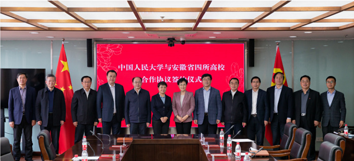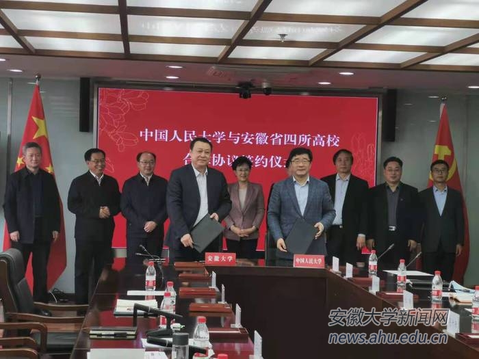 本网讯(融媒体中心 学校办公室)3月22日下午,安徽大学等4所省属高校和中国人民大学签约仪式在中国人民大学举行。副省长王翠凤,省委教育工委书记钱桂仑,中国人民大学党委书记靳诺、校长刘伟,安徽大学党委书记蔡敬民,安徽师范大学、安徽农业大学、安徽财经大学与中国人民大学负责同志出席签约仪式。