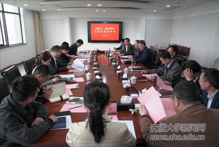 本网讯(融媒体中心 黄雨彤)3月26日下午,安徽大学与高新区管委会合作交流浅谈会在我校磬苑校区办公楼召开。合肥高新区党工委书记、管委会主任宋道军,校长匡光力出席会议。会议由副校长钱家盛主持。