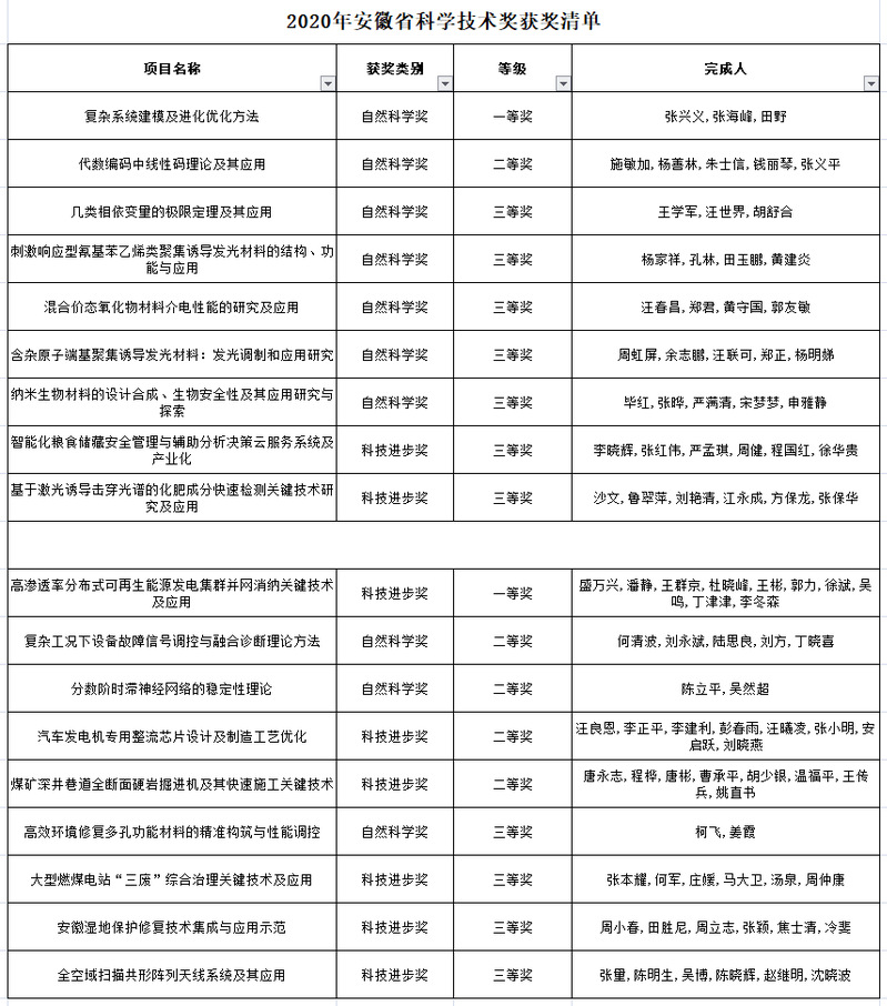 本网讯(科学技术处)4月12日上午,“安徽省科学技术奖励暨加快建设科技创新攻坚力量体系推进大会”在合肥召开。我校共获得安徽省科学技术奖18项(一等奖2项、二等奖5项、三等奖11项),获奖总数再创新高,其中以第一完成单位获得自然科学一等奖1项,实现以第一完成单位获自然科学一等奖连续三年不间断。