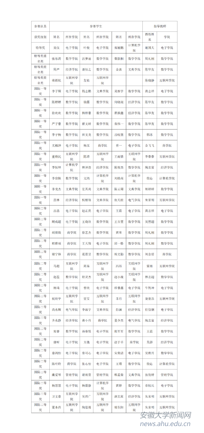本网讯(数学科学学院 周礼刚 林志超)近日,2021年国际大学生数学建模竞赛成绩揭晓,我校学员荣获国际特等奖(Outstanding Winner) 1项,国际特等奖提名奖(Finalist) 3项,国际一等奖(Meritorious) 11项,国际二等奖(Honorable Mentions) 19项,创造安徽省高校历史最好成绩。
