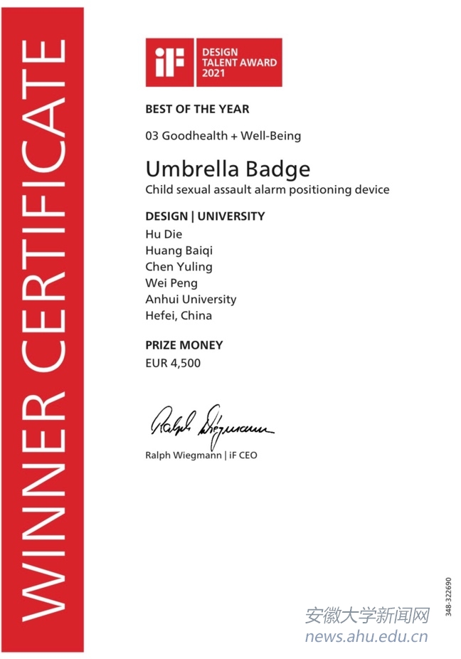 本网讯(艺术学院)近日,艺术学院设计系2019级视觉传达设计专业本科生胡蝶、魏芃、黄柏淇,陈瑜玲四位同学的小组作品“Umbrella Badge”获2021德国iF设计新秀奖(iF Design Talent Award)、年度最佳奖(Best of the year)以及4500欧元的奖金。该作品由艺术学院设计系教师岳威、张帆和刘冰三位老师共同指导完成,展现了学院“以赛促学,以赛促教”的教学理念,是学院深化培养创新型复合人才目标的重要成果。