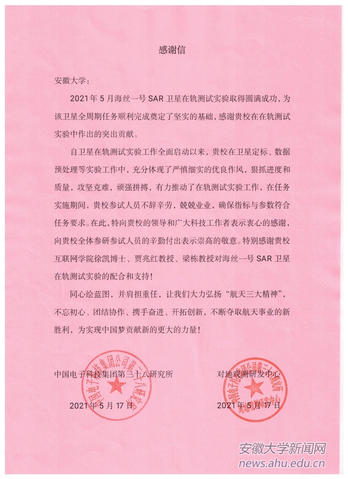 本网讯(科学技术处) 5月17日,中国电子科技集团第三十八研究所向我校发来感谢信,感谢我校为中国首颗商业SAR卫星海丝一号在轨测试实验成功作出突出贡献。