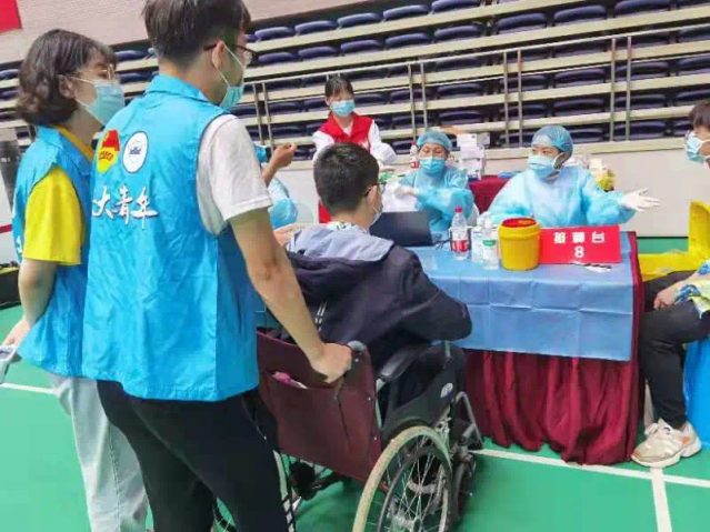 5月15日中午,磬苑校区疫苗接种点来了一位特殊的学生,他在父亲的陪同下坐着轮椅来到现场,但由于父亲不熟悉接种流程,迟迟没有开始接种疫苗。社会与政治学院的陈伟俊看见这一幕便立即上前帮忙,推着他完成了体温检测、登记、接种、以及留观等待等疫苗接种程序。“这次志愿活动是我备战考研过程中一次难得又特别的机会,虽然我现在还只是预备党员,但通过志愿者工作,更加深刻地体会到党员的责任和担当。”陈伟俊同学表示。