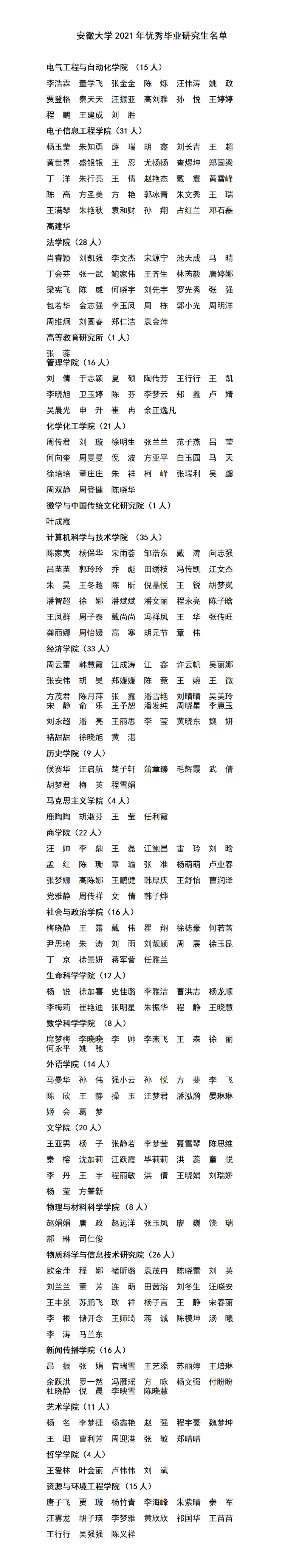 本网讯(融媒体中心 徐红)经个人申请、班级评议、学院评审、公示和学校审核、公示,学校决定授予759位同学“安徽大学2021年优秀本科毕业生”荣誉称号,授予366位同学“2021年安徽大学优秀毕业研究生”荣誉称号。