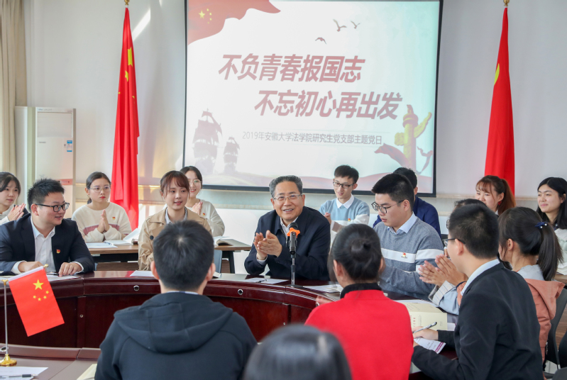 2019年10月,省委书记李锦斌参加法学院研究生党支部 “不负青春报国志 不忘初心再出发”主题党日活动。李锦斌书记勉励青年学生发扬老一辈光荣传统,争做有理想、有本领、有担当的新时代德法兼修高素质人才。法学院构建了厚植家国情怀、人文情怀和世界胸怀的通识教育、课程思政、日常思政融会贯通的德育体系,推进“德育”有“新”更走“心”。