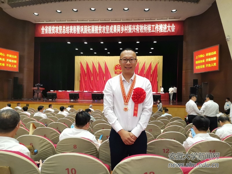 省委副书记程丽华宣读关于表彰安徽省先进个人和先进集体的决定。我校电气工程与自动化学院专职辅导员杨国志同志被安徽省委、安徽省人民政府授予“安徽省脱贫攻坚先进个人”荣誉称号,并作为先进个人代表在主会场接受表彰。杨国志同志积极响应国家号召,作为安徽省第七批选派扶贫干部投身脱贫攻坚一线驻村开展扶贫工作,四年来有效发挥安徽大学在教育、科技、人才等方面优势,组建学生实践团队,在调研、助学、科普等方面助力脱贫攻坚,积极争取多方面资源,研究探索阜南县王化镇张集村脱贫致富之策。与工作队同志一同为全村扶贫工作做了大量艰苦细致、富有成效的工作,争取多方资金支持累计3000多万元,帮助全村341户贫困户家庭脱贫,如期完成张集村整村出列任务,实现村集体经济收入由无到近80万元。