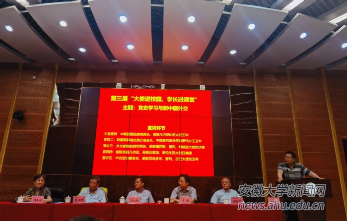 匡光力代表安徽大学向出席活动的各位大使、嘉宾表示欢迎,向一直以来关心支持我校建设发展的专家表示感谢。他指出,在全国上下喜迎建党一百周年之际,安徽大学召开以“党史学习与新中国外交”为主题的“大使进校园学长进课堂”活动,具有很强的现实意义,是我校响应党中央开展党史学习教育号召的重要活动之一。在推进党史学习教育进课堂、进教材、进头脑的同时,厚植师生家国情怀,教育师生不忘初心、牢记使命,为实现中华民族伟大复兴不懈努力。