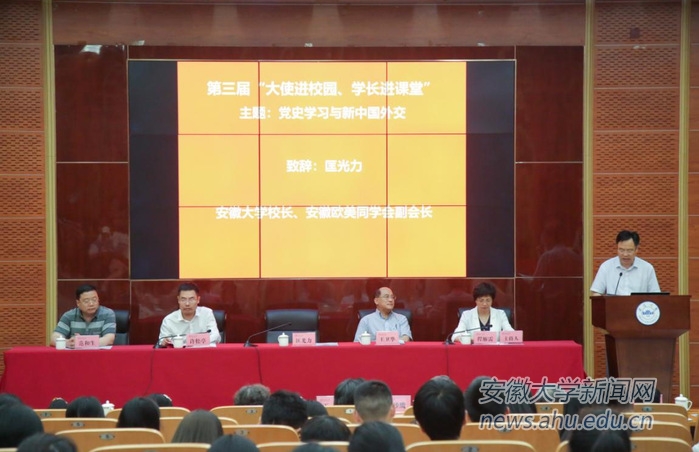 本网讯(安徽大学拉丁美洲研究所 唐惠敏)6月16日,我校在磬苑校区文典阁成功举办第三届“大使进校园,学长进课堂”活动。安徽欧美同学会秘书长许松亭,欧美同学会拉美分会秘书长潘灯,校长匡光力,校党委常委、副校长程雁雷出席活动。活动由程雁雷主持。
