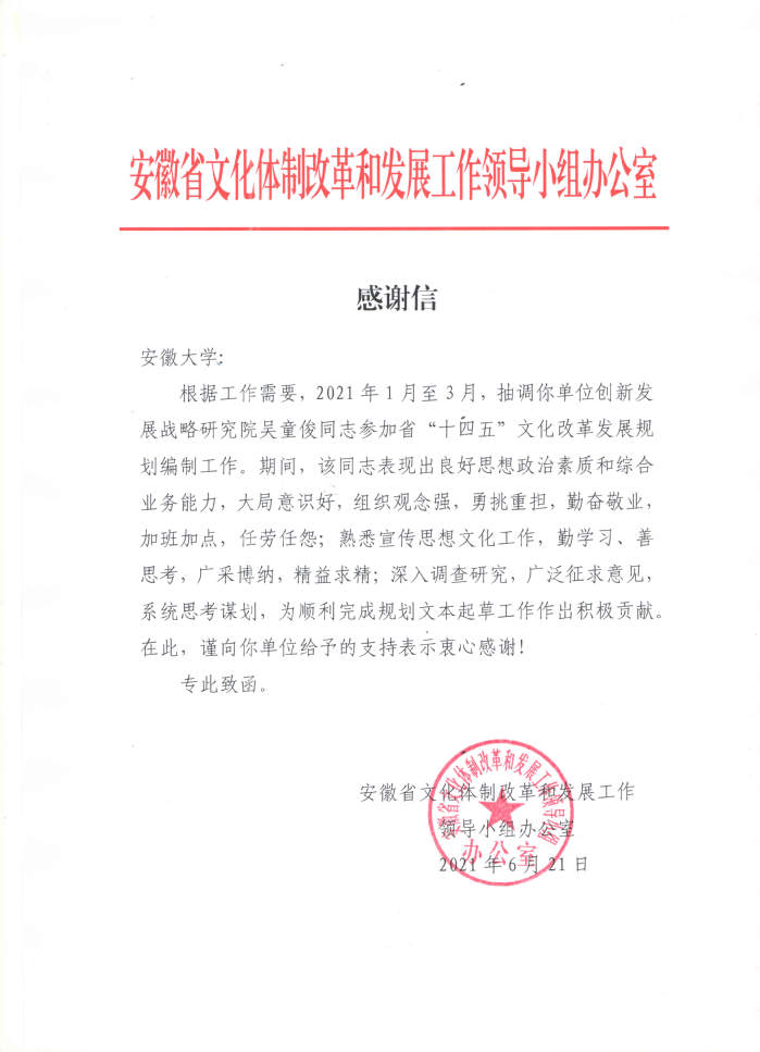 本网讯(创新发展战略研究院 唐惠敏)近日,省文化体制改革和发展工作领导小组办公室向我校发来感谢信,致函感谢创新发展战略研究院研究生吴童俊对省“十四五”文化改革发展规划编制工作作出的积极贡献。感谢信中,省文化体制改革和发展工作领导小组对吴童俊同学的政治素质和综合业务能力作出高度肯定和评价,认为该同学大局意识好,组织观念强,勤奋敬业;熟悉宣传思想文化工作,勤学习、善思考;注重调查研究,系统谋划能力强,为顺利完成规划文本起草工作贡献智慧和力量。