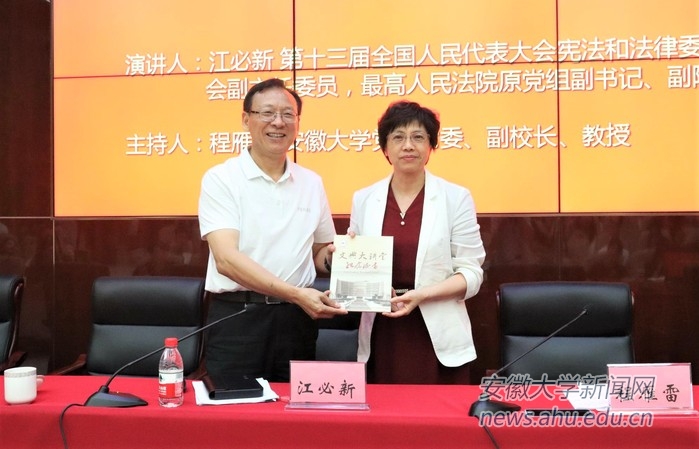 本网讯(融媒体中心 赵玉婷)7月3日晚,第十三届全国人民代表大会宪法和法律委员会副主任委员、最高人民法院原党组副书记、副院长江必新在我校磬苑校区文典阁报告厅作题为“新《中华人民共和国行政处罚法》的若干问题”的讲座。校党委常委、副校长程雁雷主持讲座并为江必新颁发了纪念证书。