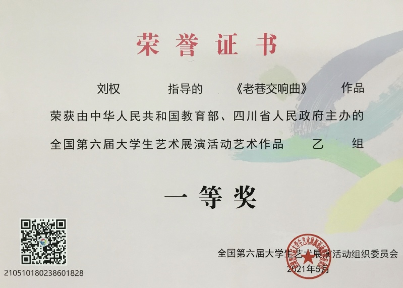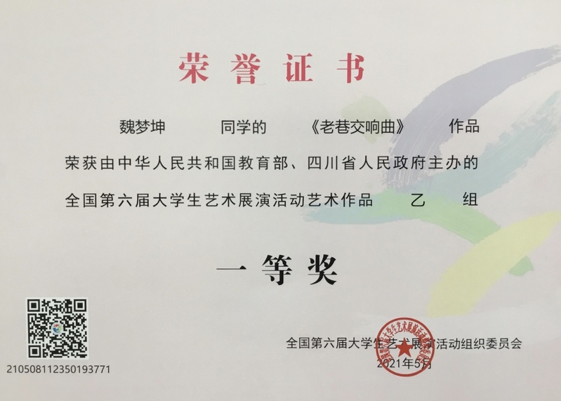 本网讯(艺术学院 刘晓健)近期,我院美术系2018级研究生魏梦坤的作品《老巷交响曲》(导师:刘权)在全国第六届大学生艺术展演中获得国赛一等奖。