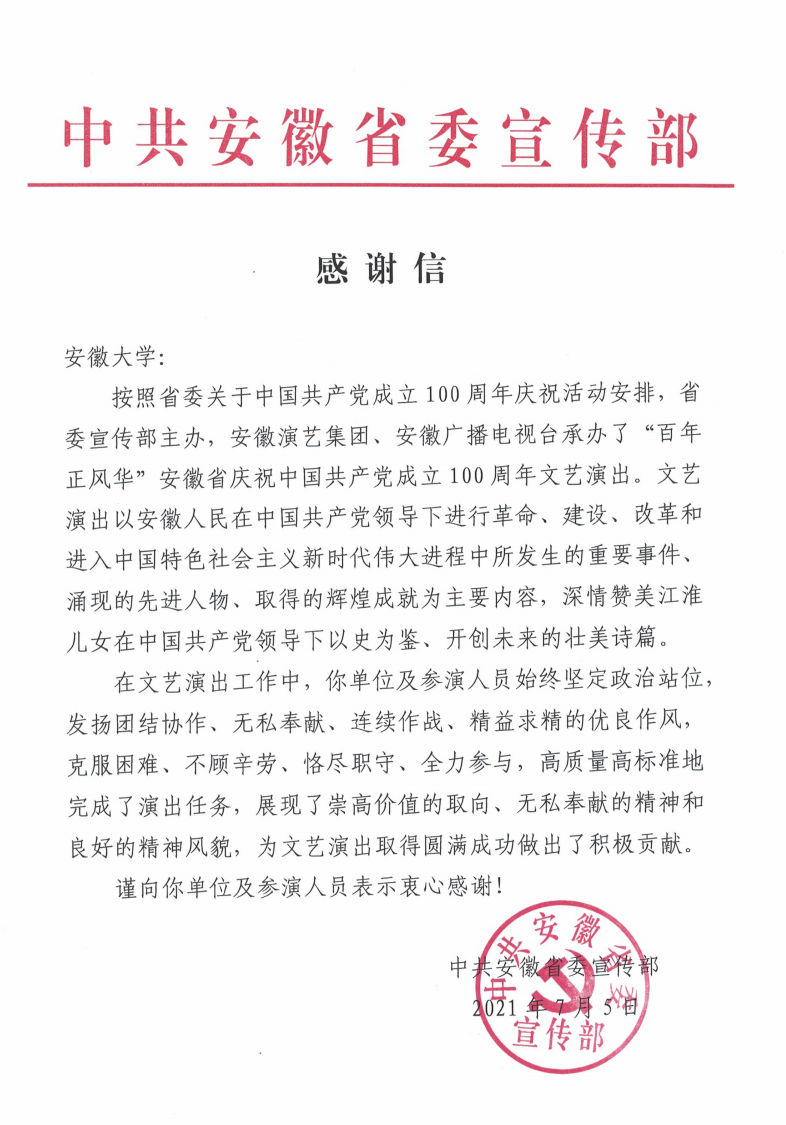 本网讯(艺术学院 刘晓健)近日,中共安徽省委宣传部向我校发来感谢信,对我校及参演人员为“百年正风华”安徽省庆祝中国共产党成立100周年文艺演出圆满成功做出的积极贡献表示感谢。