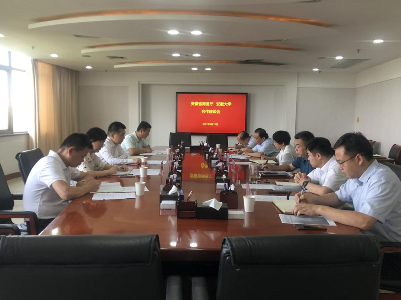 安徽省商务厅与学校有关职能部门、学院负责人参加座谈会。