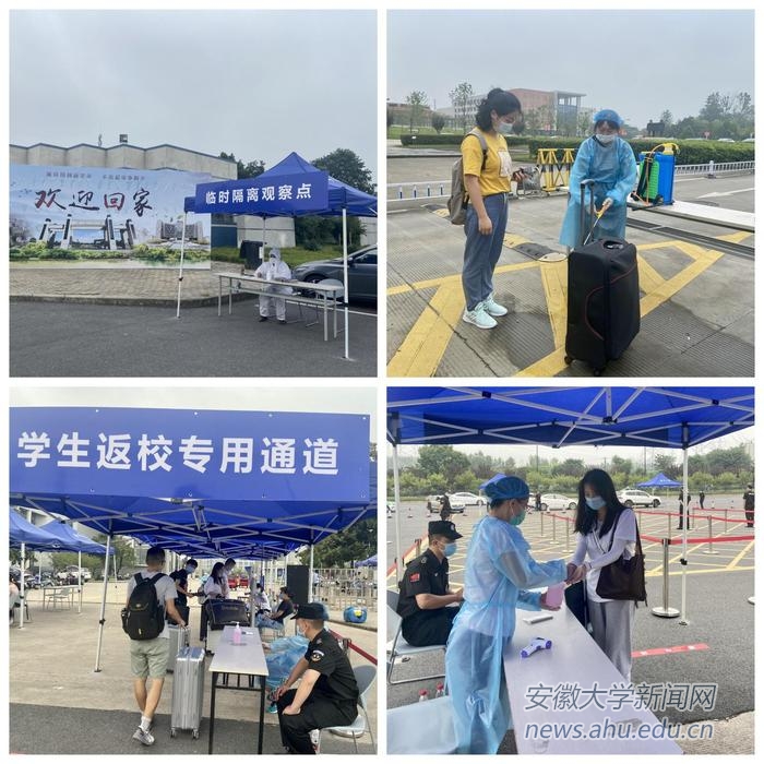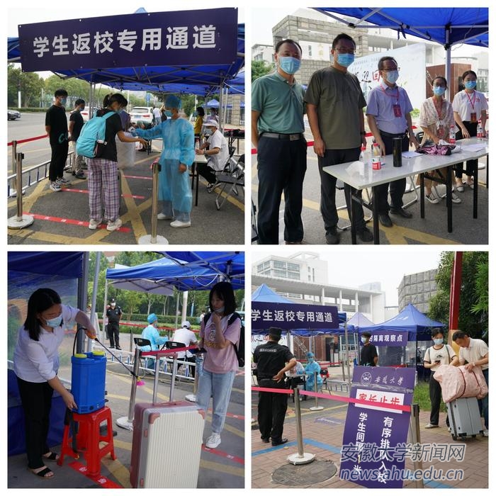 在龙河校区南门、磬苑校区南门、北门和西门,前来报到的学生在工作人员的引导下,佩戴口罩、间隔1米以上,有序穿过学校闸门,进入学生返校专用通道,在完成体温测量、手部清洁、入校信息核验、行李消杀等流程后,进入久违的校园。