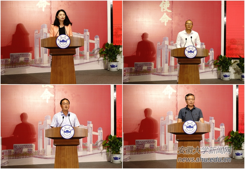 “三全育人”先进个人代表陈芳,省脱贫攻坚先进个人、校脱贫攻坚专项奖励获得者、师德标兵代表杨国志,“李世雄奖”获得者代表鲍炎红,师德建设先进集体负责人代表罗斌分别在会上发言。