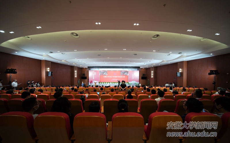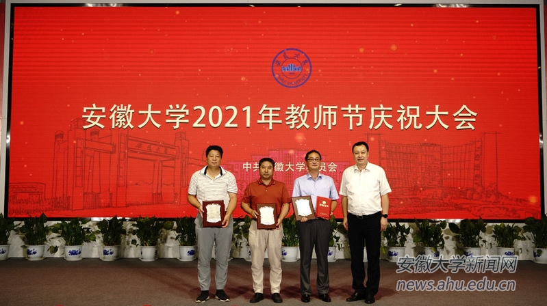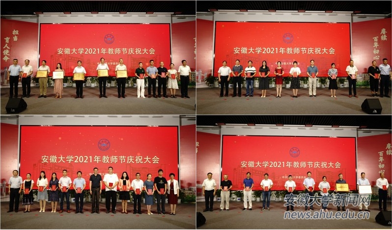 匡光力宣读表彰决定,表彰安徽大学抗击新冠肺炎疫情先进集体和个人、校脱贫攻坚专项奖获奖集体和个人、“2019-2020学年本科课堂教学优秀奖”获奖教师、“三全育人”先进个人、师德建设先进集体、师德标兵、师德先进个人,以及第十四届“李世雄奖”获得者。校领导分别向先进集体和先进个人代表颁奖。