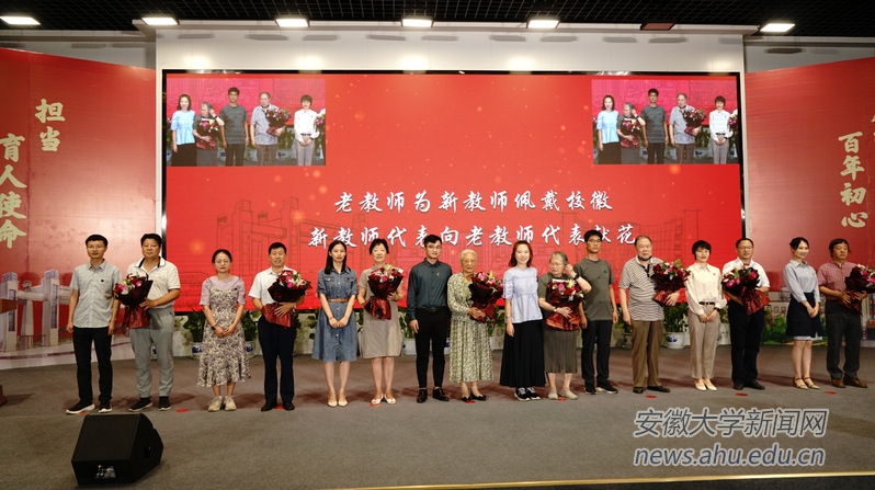 随后,老教师代表为新教师代表佩戴校徽,新教师代表向老教师代表献花。