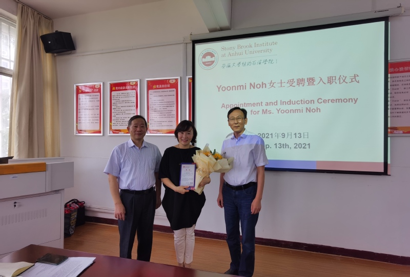 本网讯(安徽大学纽约石溪学院 姚中峰 )2021年9月13日下午,安徽大学纽约石溪学院举行仪式,聘请石溪大学国际学院副院长Yoonmi Noh女士担任石溪学院外方副院长。校党委常委、副校长、安徽大学纽约石溪学院院长薛照明,国际合作与交流处处长胡学文,石溪学院副院长陈华友、吴明在、吴然超、黄振出席会议,学院全体工作人员参加会议。会议由学院直属党支部书记葛德义主持。