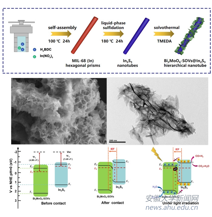 该课题组以自组装的MIL-68(In)为模板获得In2S3纳米管,并在其上均匀生长富含表面氧空位的二维Bi2MoO6纳米片去构建分层的Bi2MoO6-SOVs@In2S3异质结纳米管。装饰有二维超薄亚基的中空管状结构有利于增强界面接触,提供更多反应位点并增强光利用率。此外,密度泛函理论(DFT)计算和系统表征的结合证实了S型电荷转移机制和表面氧空位的存在,并验证了其在加速电荷分离和改善氧化还原能力方面的作用。因此,优化的Bi2MoO6-SOVs@In2S3异质结构在光催化CO2还原方面表现出令人印象深刻的性能(CO生成的产率和选择性分别为28.54 μmol g-1 h-1和94.1%),并且在连续光照下具有出色的稳定性。这项研究将为探索和构建用于太阳能驱动转换的高性能光合作用组件提供新的视角。