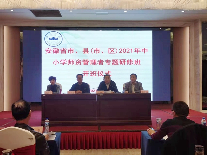 本网讯(继续教育学院 戴坤乾)10月19日上午,由省教育厅主办、我校承办的安徽省市、县(市、区)2021年中小学师资管理者专题研修班在合肥开班,全省各市、县(市、区)教育局分管局长、人事科长以及师资培训机构主要负责人近240人参加了研修班。校党委常委、纪委书记、监察专员王忠,省教育厅师资处处长朱玉华、四级调研员查榕宁出席开班仪式。我校继续教育学院院长张立奇主持开班仪式。